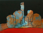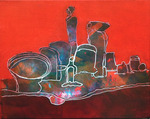 2011geinspireerd door Giorgio Morandi die zijn hele leven alleen stillevens schilderde van potjes in allerlei vormen; veelal in pasteltinten. In ijn schilderij heb ik geen potjes, maar vormen geschilderd met strakke lijnen; kleur rood en zwart en de vormen hebben een bruinachtige tint.