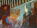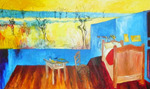 2013De interieur-schilderijen van Henri Matisse en specifiek het vervreemdende perspectief zetten mij aan tot het oppakken van mijn prive-inteieur en daarna fantasierijke interieurs te scheppen op doek. Totaal schilderde ik 6 interieur-schilderijen als een hommage aan henri matisse